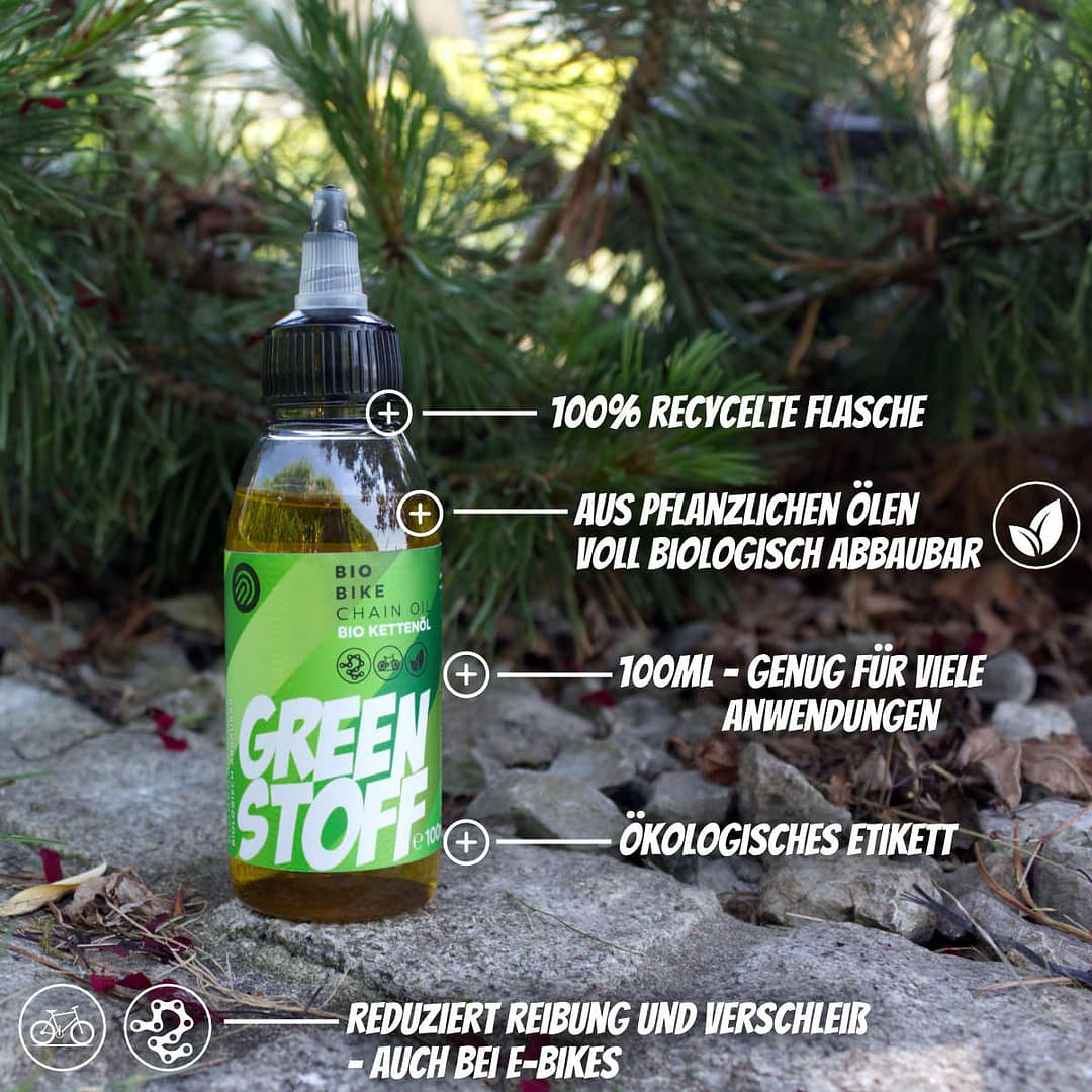 Deshalb liefern wir eine pflanzliche Alternative. Das Green Stoff Bike Chain Oil setzt auf 100 % natürliche Öle aus Pflanzen, die selbstverständlich bis zu 100% vollständig biologisch abbaubar sind.